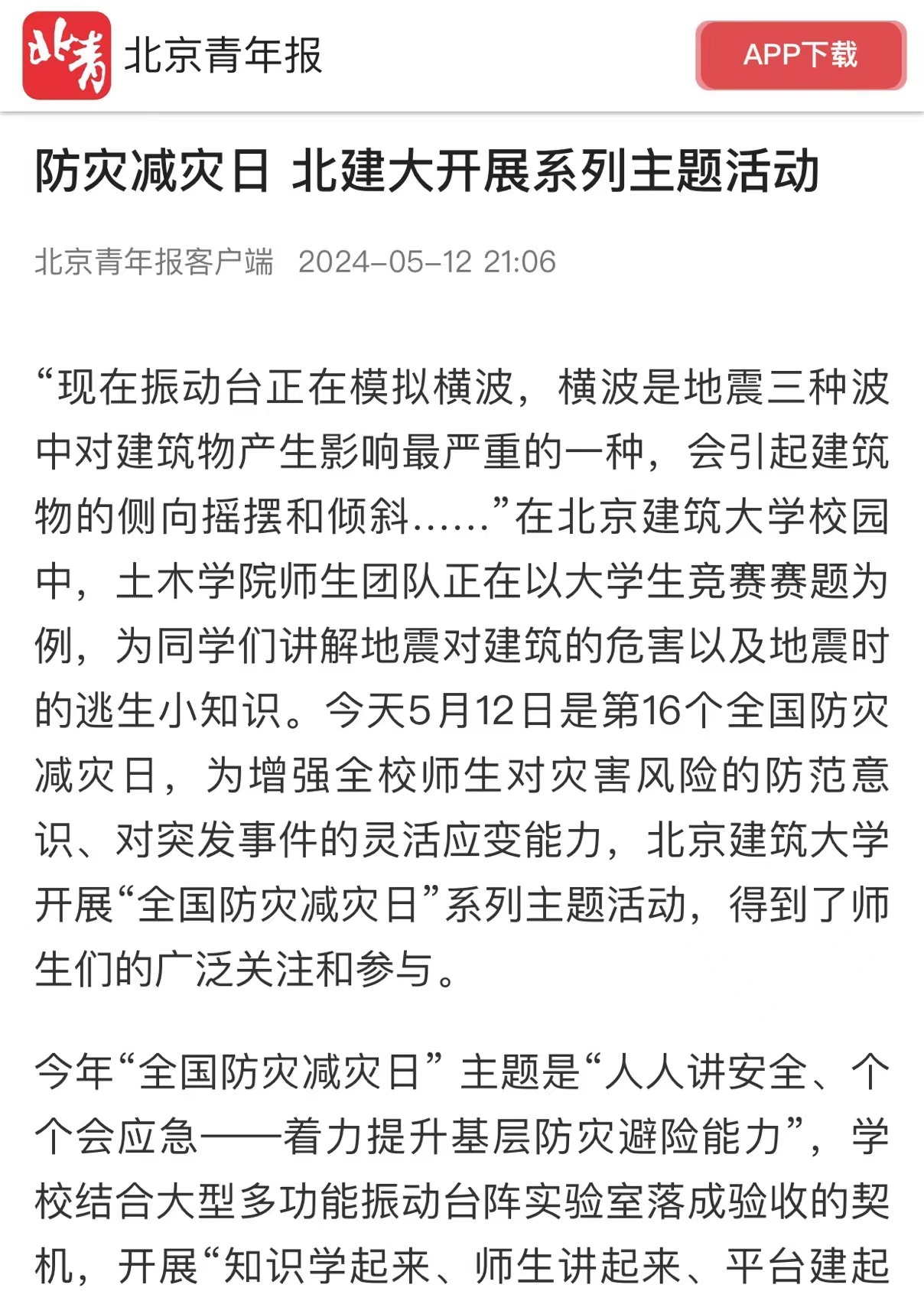 yl7703永利官网师生积极投身土木工程防灾领域,团队成果已应用于高层隔震住宅群、国家文物保护建筑、中小学校舍、医院等60余项重要建筑隔震加固工程项目。作为京津冀唯一的四台阵高水平开放式抗震试验平台——大型多功能振动台阵实验室近期将迎来落成仪式,承担省部级以上科研项目课题30余项,未来将建成防震减灾高端研究人才的培养基地和科普教育基地。北建大连续十三年承办的北京市大学生建筑结构设计竞赛也将于下月举行,将以《考虑水平振动的高耸塔式结构设计与模型制作》为题,组织项目团队开展受力分析、结构设计、模型制作及加载试验。